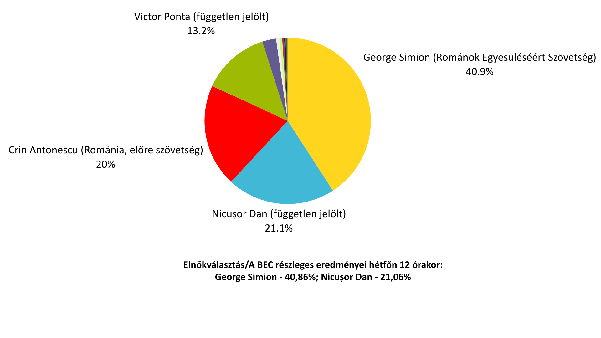 A BEC részleges eredményei, a szavazatok 98,52 százalékos feldolgozottságnál, hétfőn 12 órakor: George Simion – 40,86%; Nicușor Dan – 21,06%